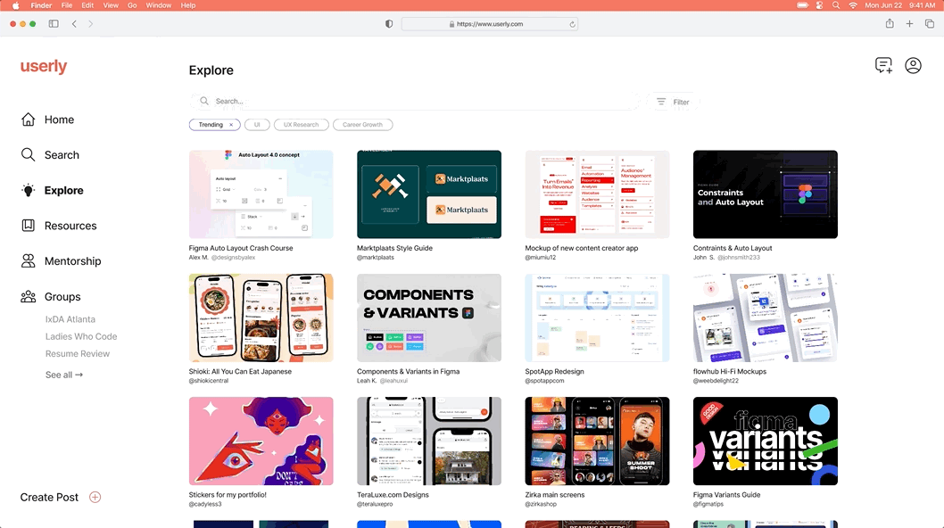 So, we shifted our desire of wanting an area where people can receive feedback on their designs, resumes, portfolios, and more into a group feature instead of its own element. We decided to split “Groups” into two types: organizational groups and Userly community groups to encompass organizations and community creativity.